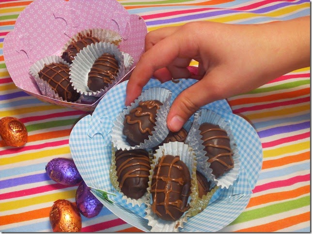 Triturar las galletas junto con el queso y formar una masa que podremos ir dandoles forma de huevo y los ponemos sobre una bandeja, los ponemos en la nevera un par de horas, derretimos el chocolate y poco a poco vamos bañando los huevos hasta que este todo cubierto y los ponemos sobre otra bandeja, y los volvemos a poner en la nevera otro par de horas y así los podremos decorar, en la decoración me ha ayudado Andrea que estos días esta muy pegada a mi para ayudar, hemos cubierto unos de chocolate negro y otros de chocolate con leche y los hemos decorado intercalando los colores.